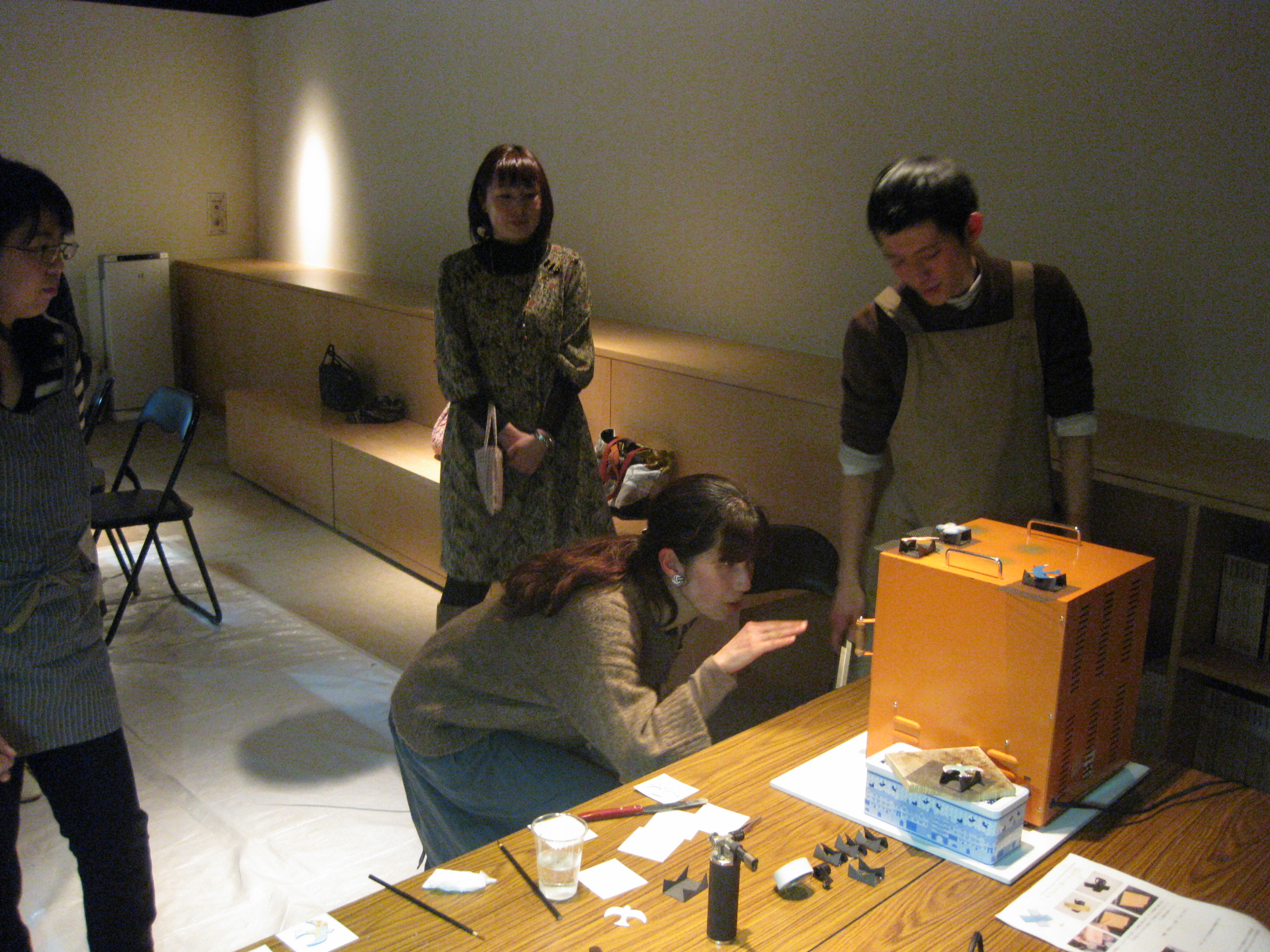 近藤先生が電気炉でひとつひとつ丁寧に焼いていきます。参加者の皆さんもその様子を見守ります。釉薬が溶けると、先程の質感から一転、見事な艶がでてきました。 |