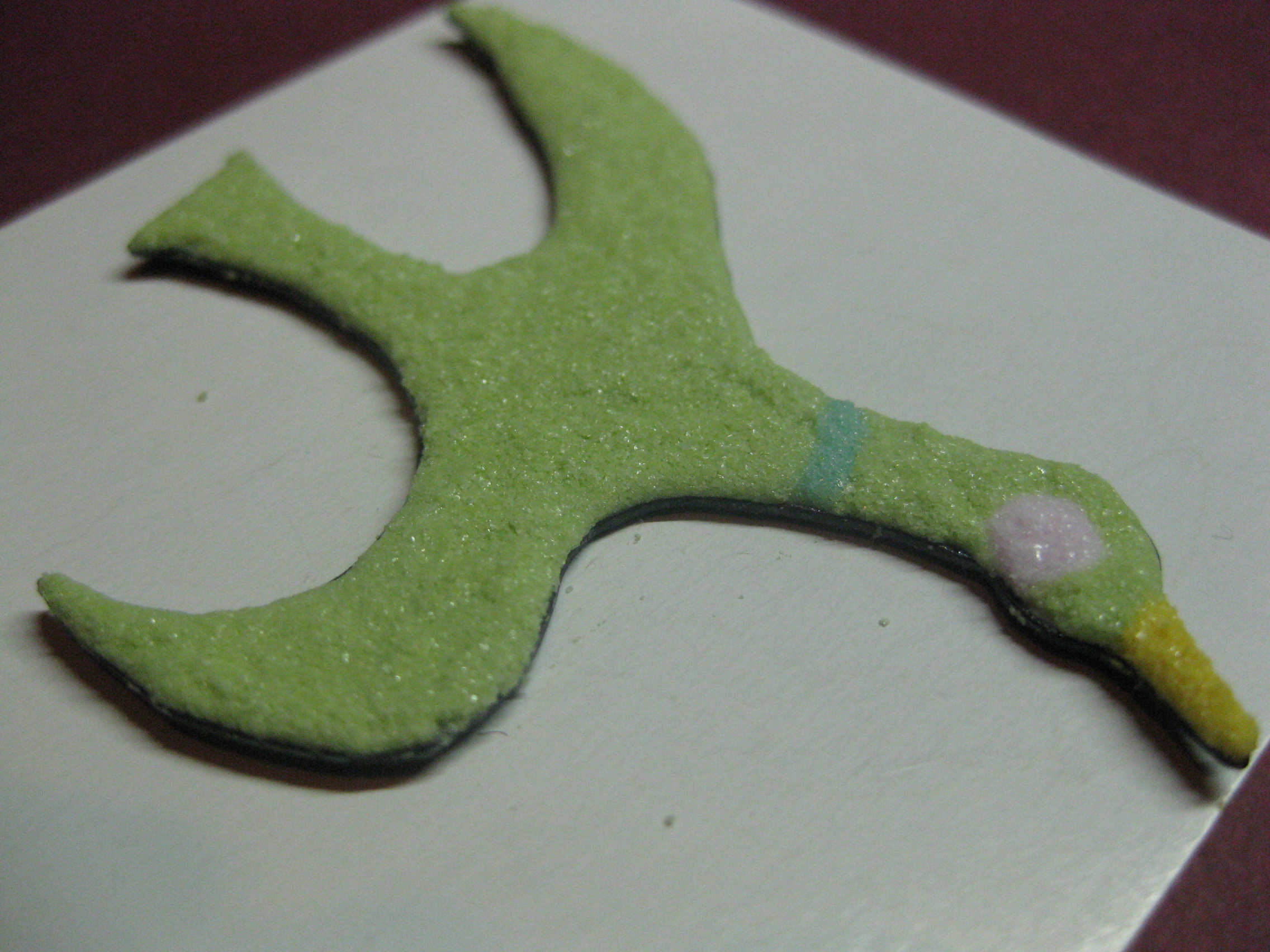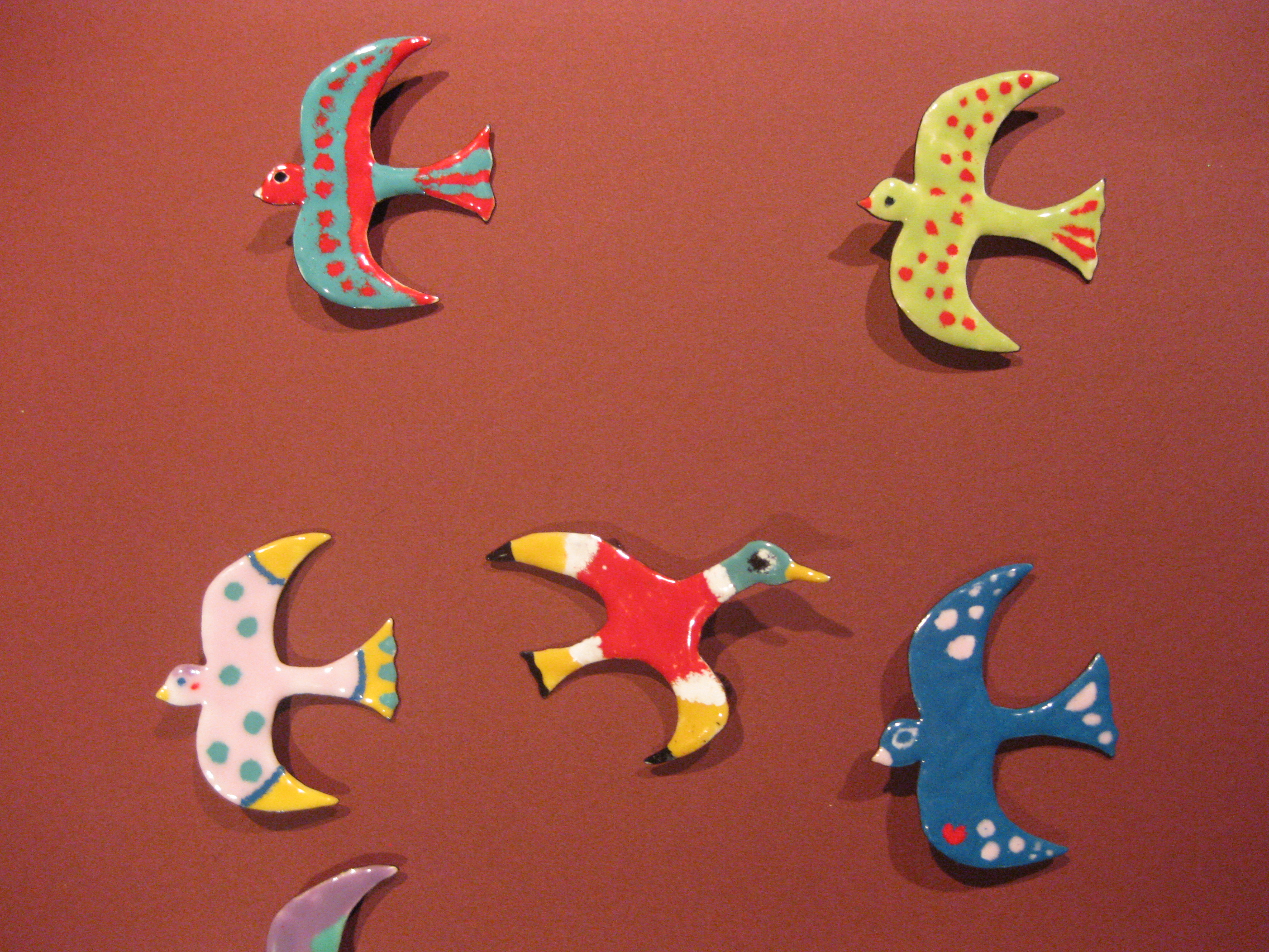 裏にブローチの金具を強力な接着剤でつけると完成。おなじ形から、さまざまな鳥や花ができました。 |