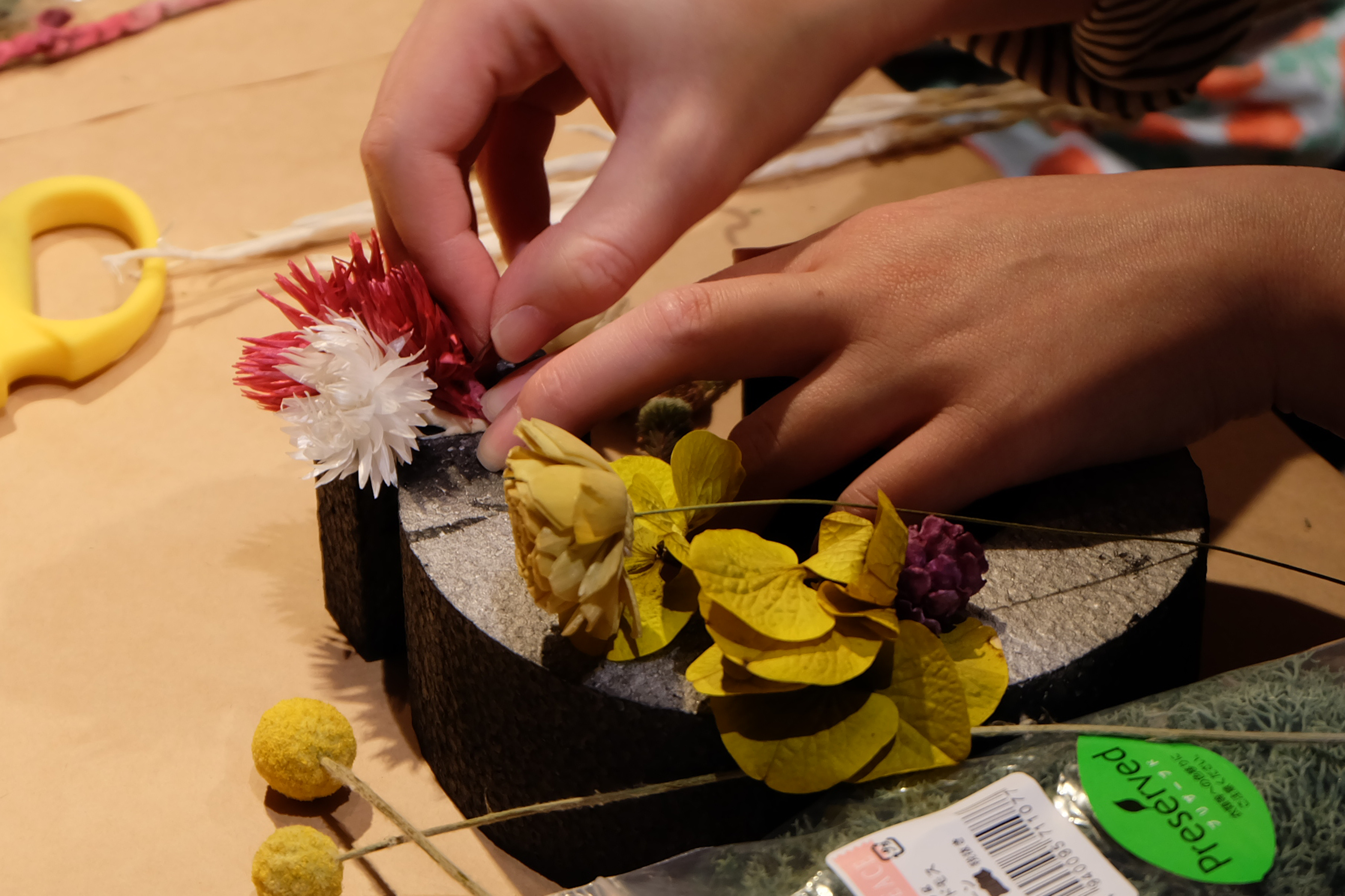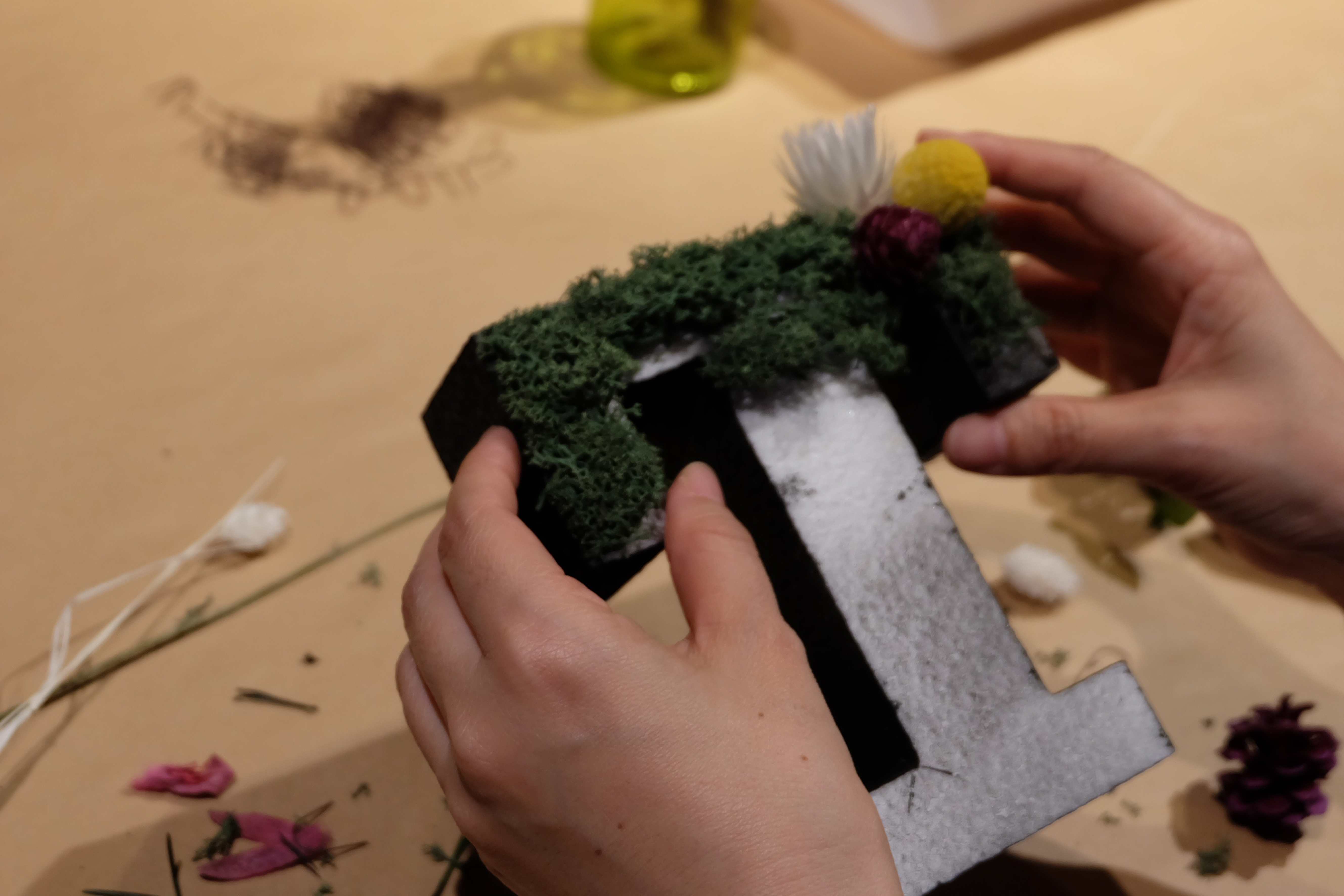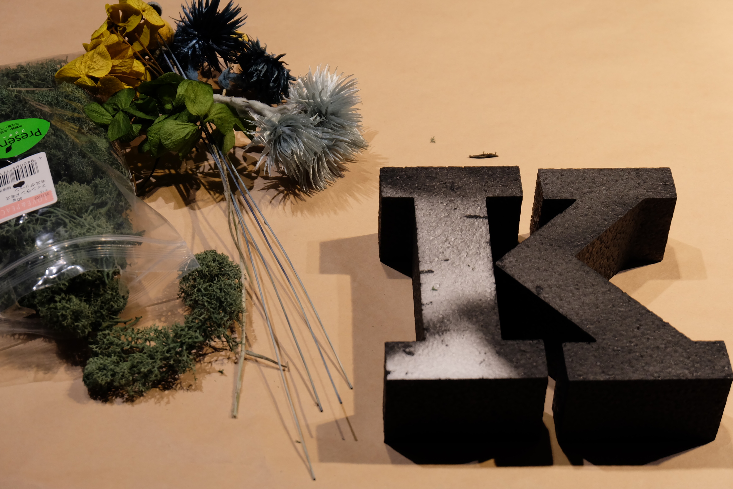 風合いあるドライフラワーでアレンジメントし、オリジナルのアルファベットを制作します。