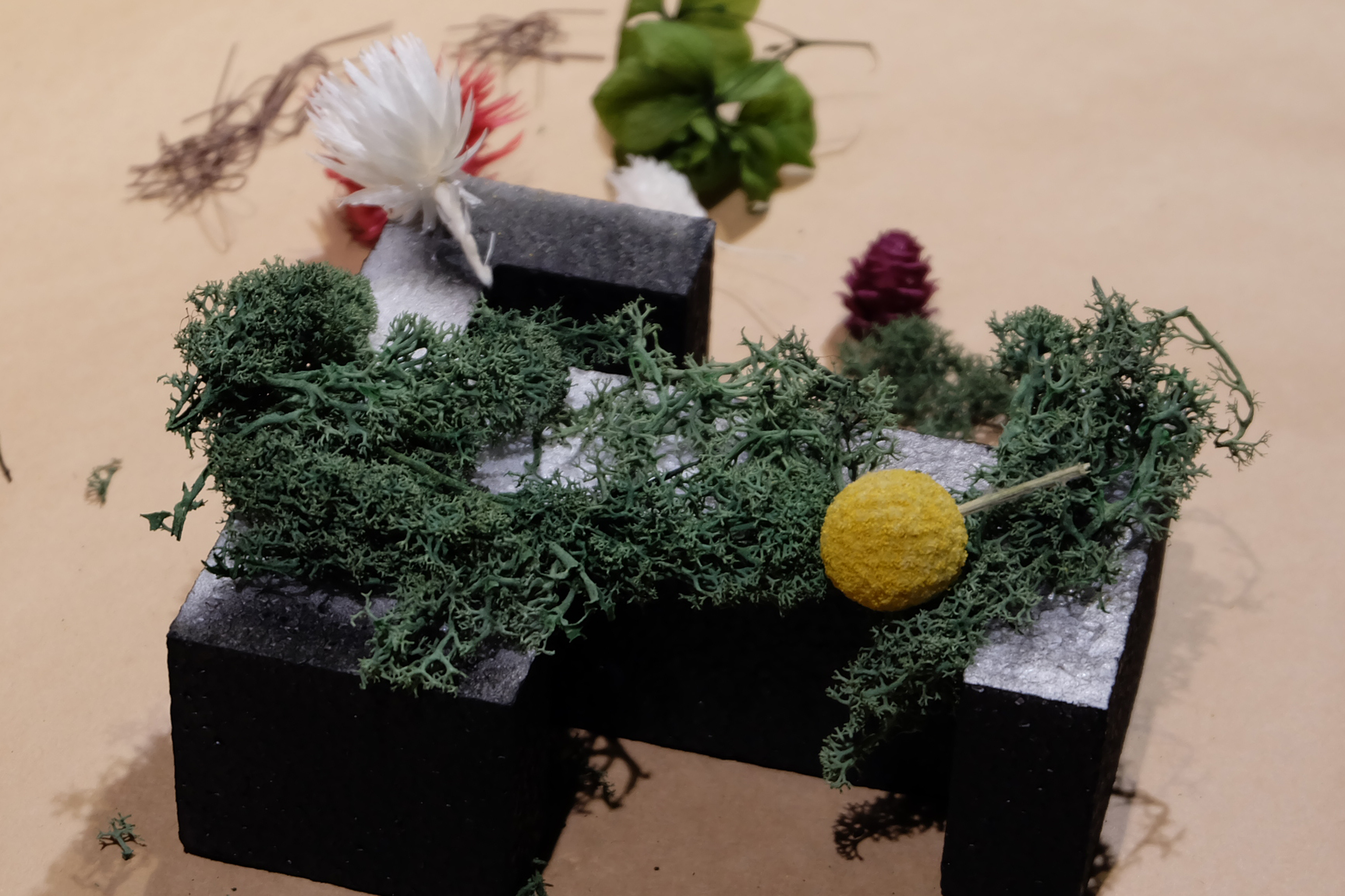 ワイヤー(Uピン)を使って花を押さえます。モスと花を交互に挿していき、パズルのように面を埋めて成形していきます。 |