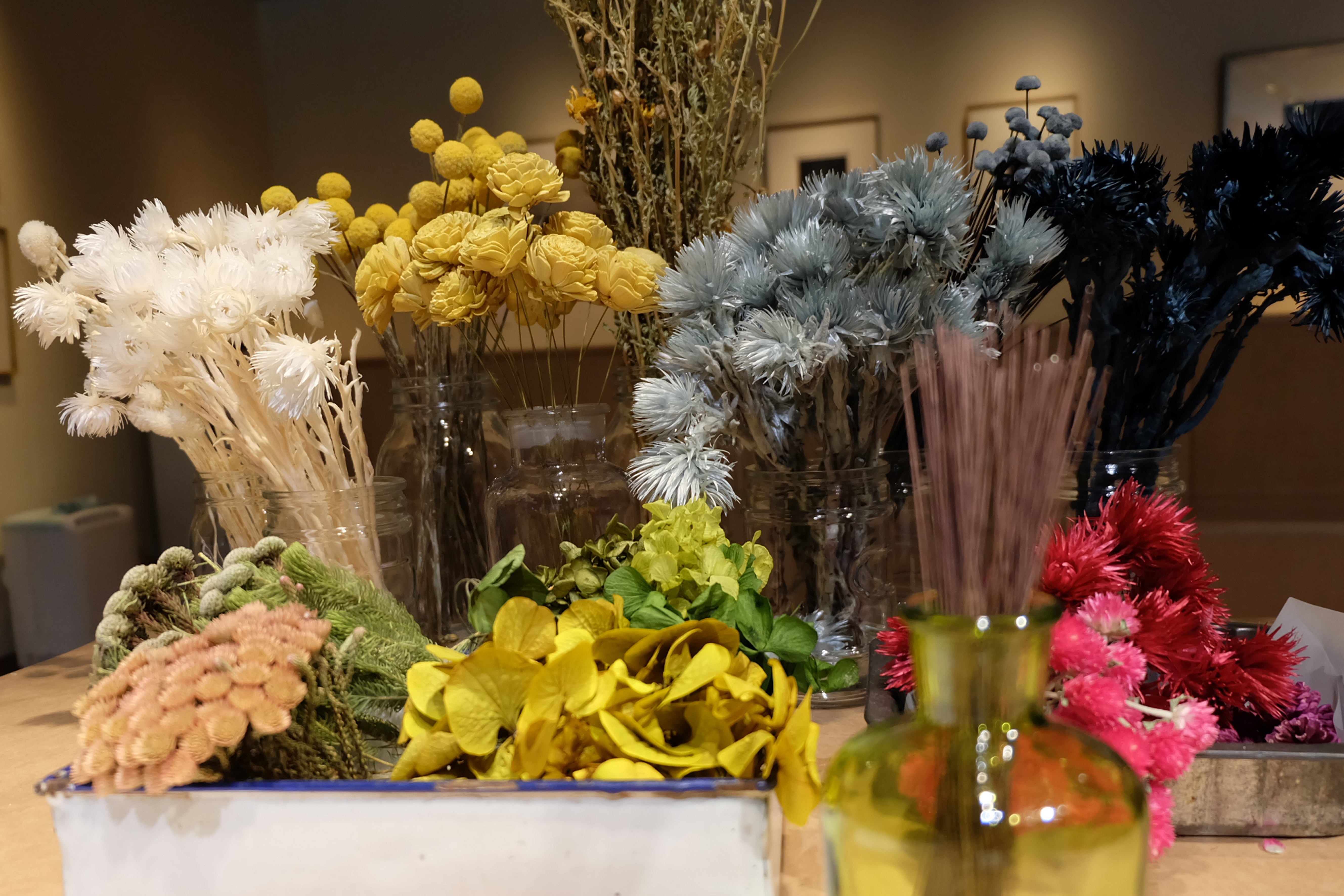今回先生にご用意いただいた花たち。浜口陽三をイメージしたスモーキーな色見を選んでくださいました。マスタードイエローの紫陽花、紫の松ぼっくり、ピンクやブルーのデイジー、グレーのボタンフラワーなど。 |