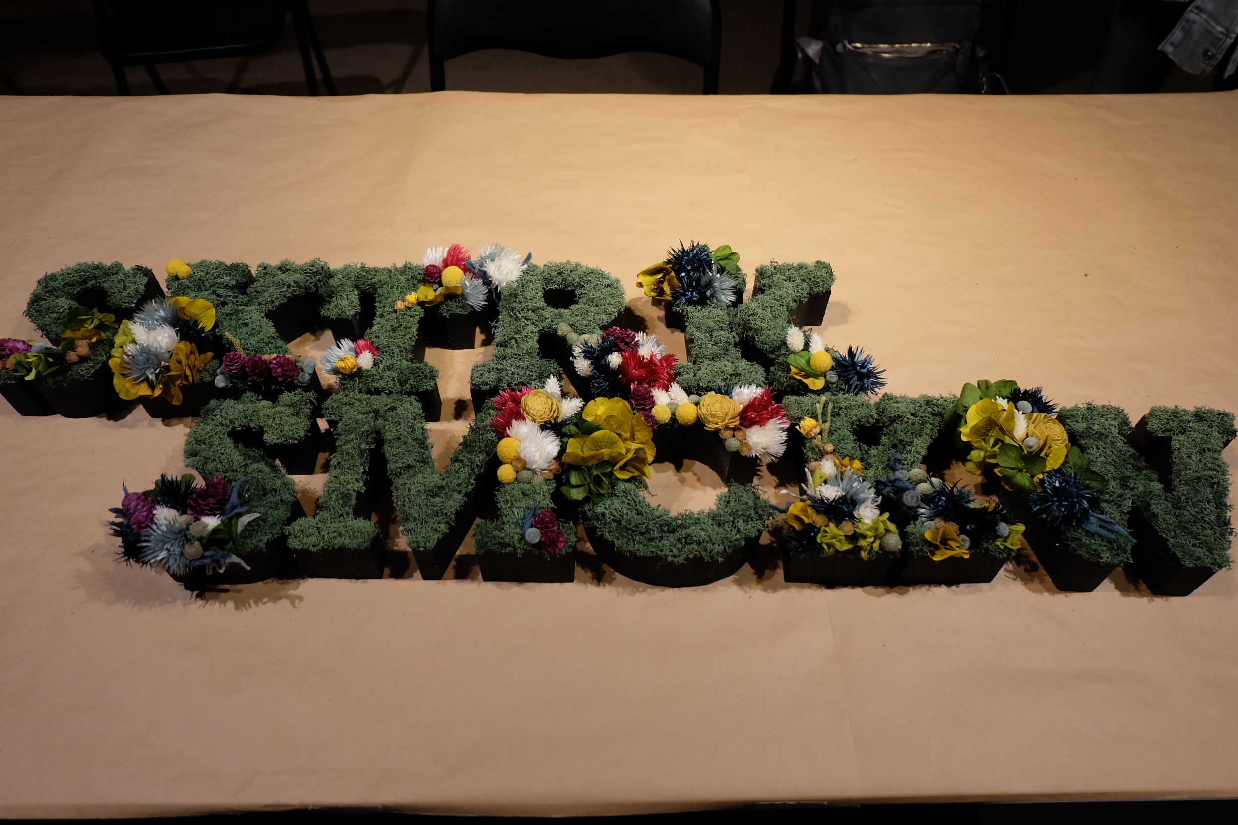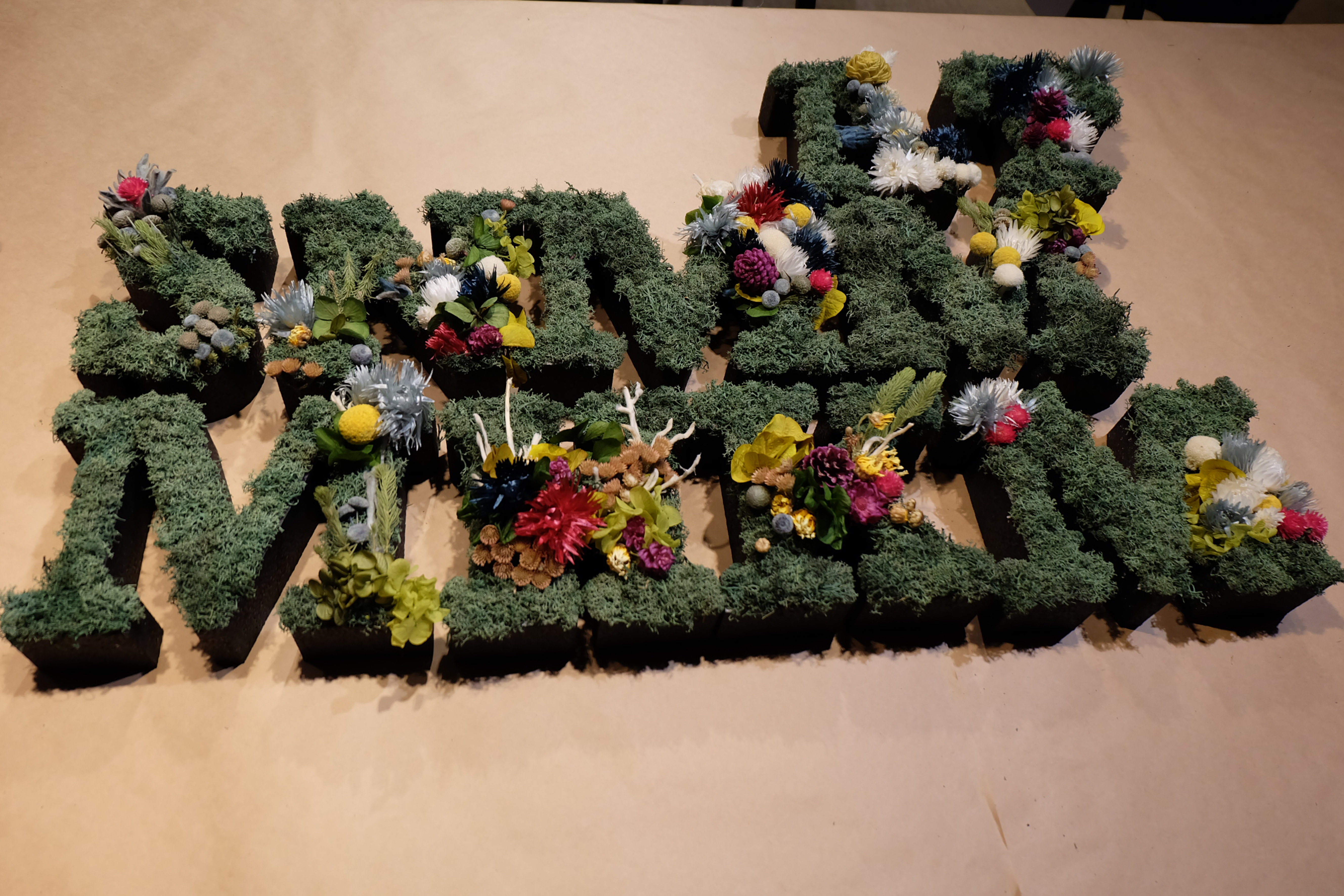 あらかじめ個々に選んでおいたアルファベットを土台に、モス(苔)と色見(花)でアレンジメントします。モスを基調に色はワンポイントとして効かせます。 |