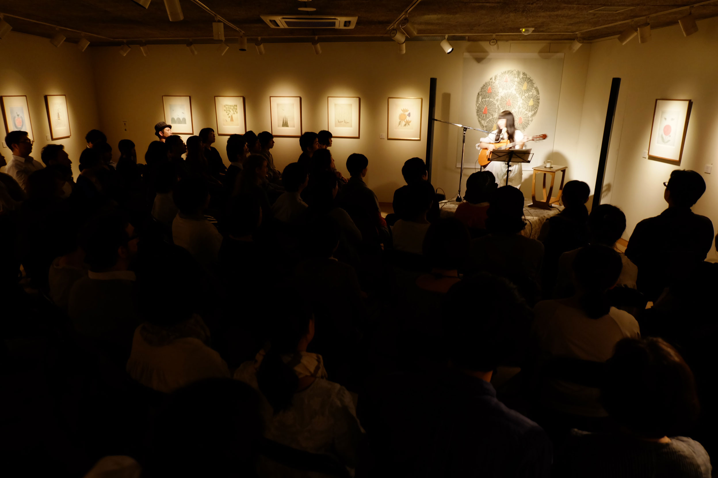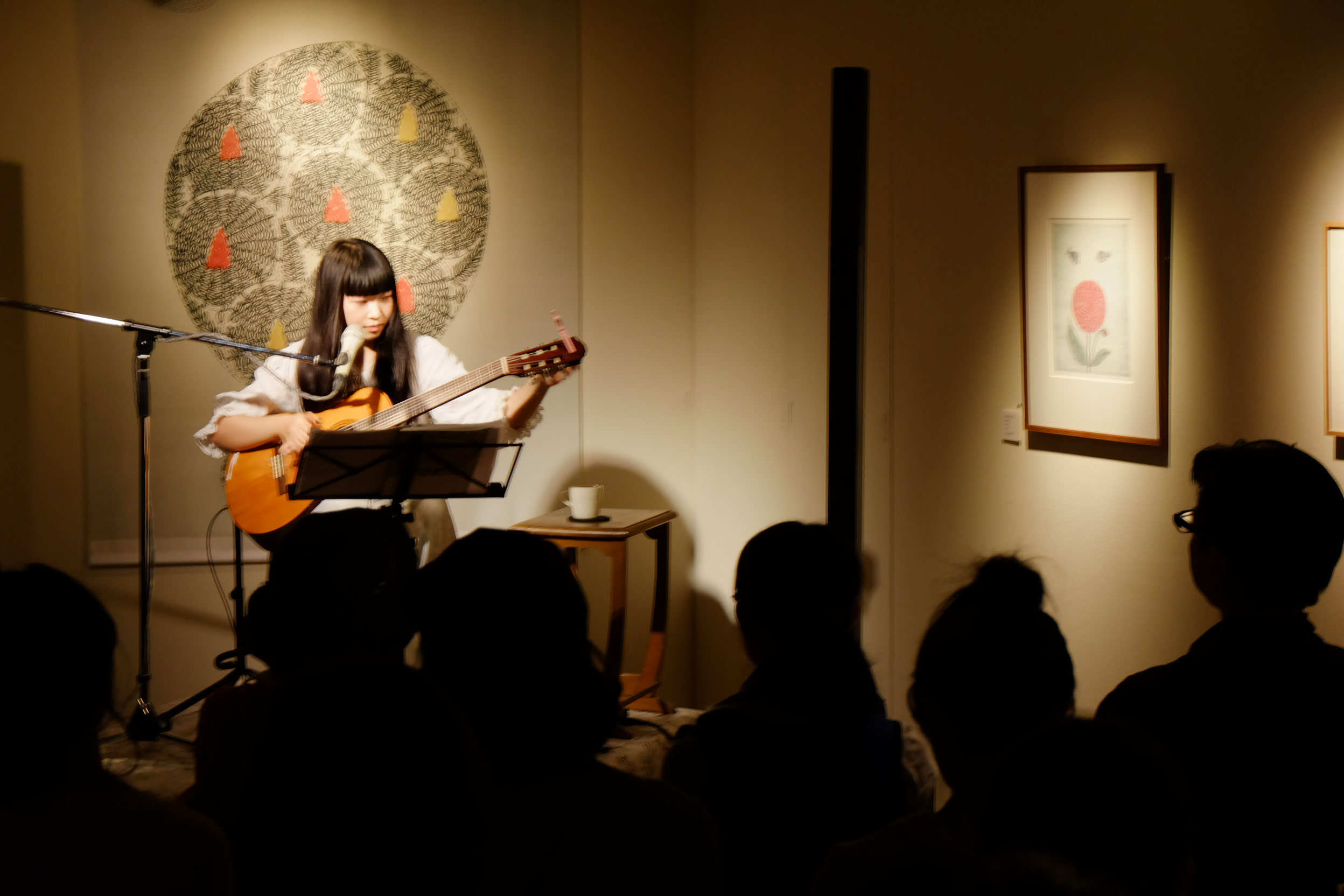若くして多方面でご活躍中の音楽家・青葉市子さんをお招きし、小さな音楽会を行いました。鳥や花やお城などの銅版画作品に囲まれた空間で、少女の心の風景をクラシックギターと共に透明に歌いあげます。