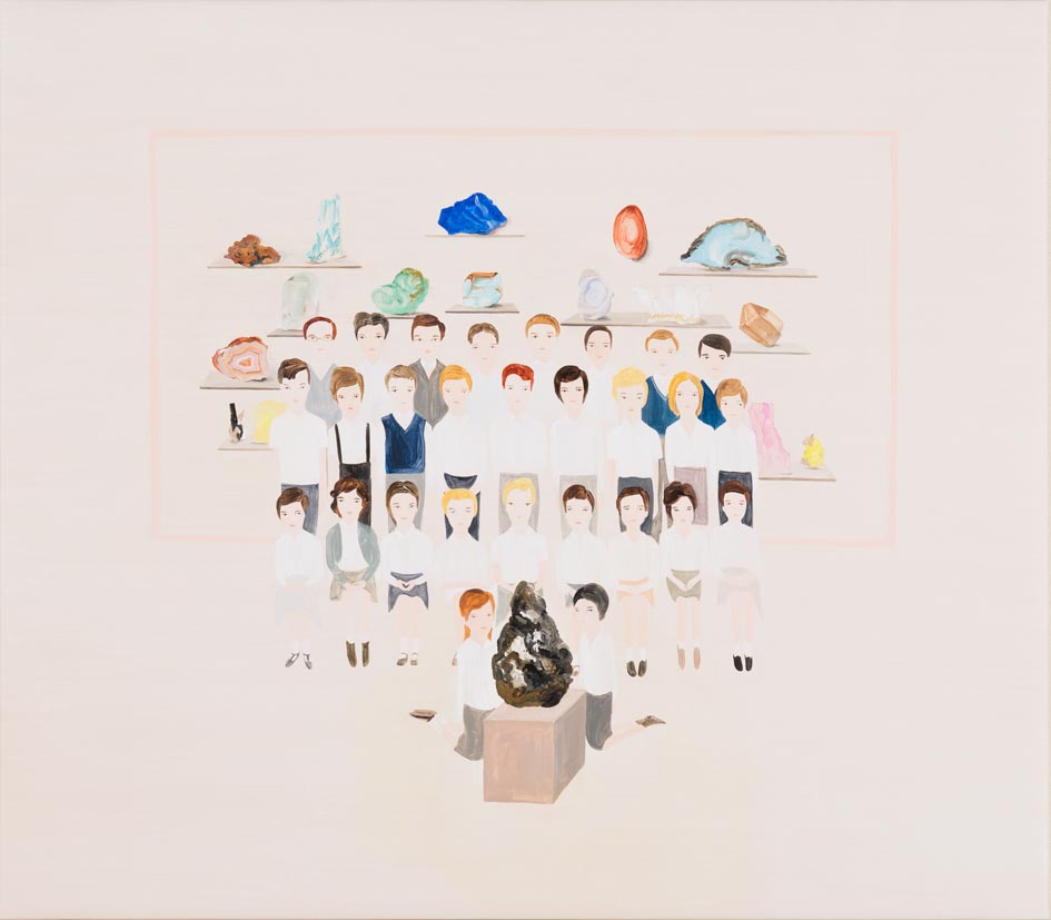 質問: アンティッチ: 質問: アンティッチ: 「鉱物標本棚」は学校の絵とも言えるのですが、私は抽象的なテーマを描こうとして、子供達を使っています。子供達がいて、鉱物の標本が後にありますけれども、実際には大地の表面の下に何があり、どんな風に分類され、どのように変化してきたのか、様々な疑問や、不安や、落ち着かない気持ち、それらをこういう形で作品にしています。 |