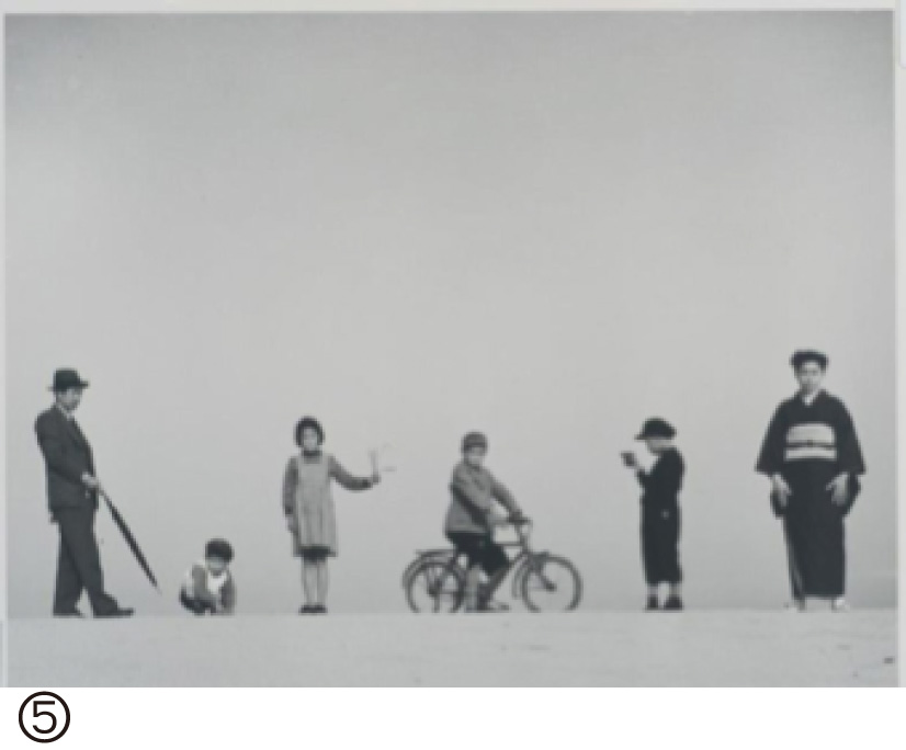 《参加者からの質問》 ▶ピクトリアリズムという手法自体が戦争をはさんでほとんど消えてしまいます。終戦して日本が復興し始め、休刊していたカメラ雑誌が復刊して月例で投稿での審査もまわるようになってきました。植田正治は代表作「パパとママと子供たち」(画像⑤)などがあり、評価を得て雑誌に出ていたのですが1952年頃をを境に10年間ほど月例の雑誌にぱたりと出なくなります。 |