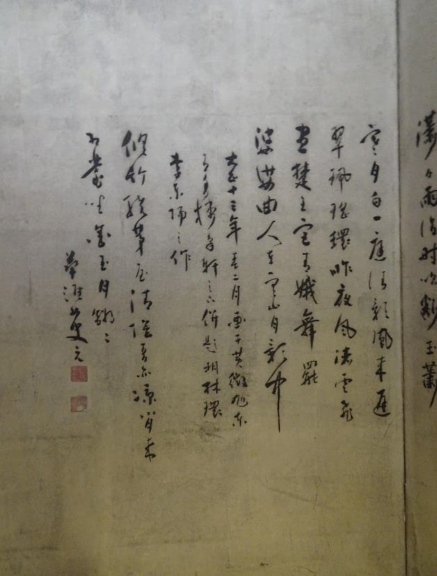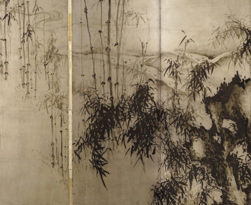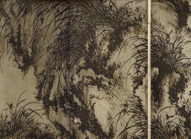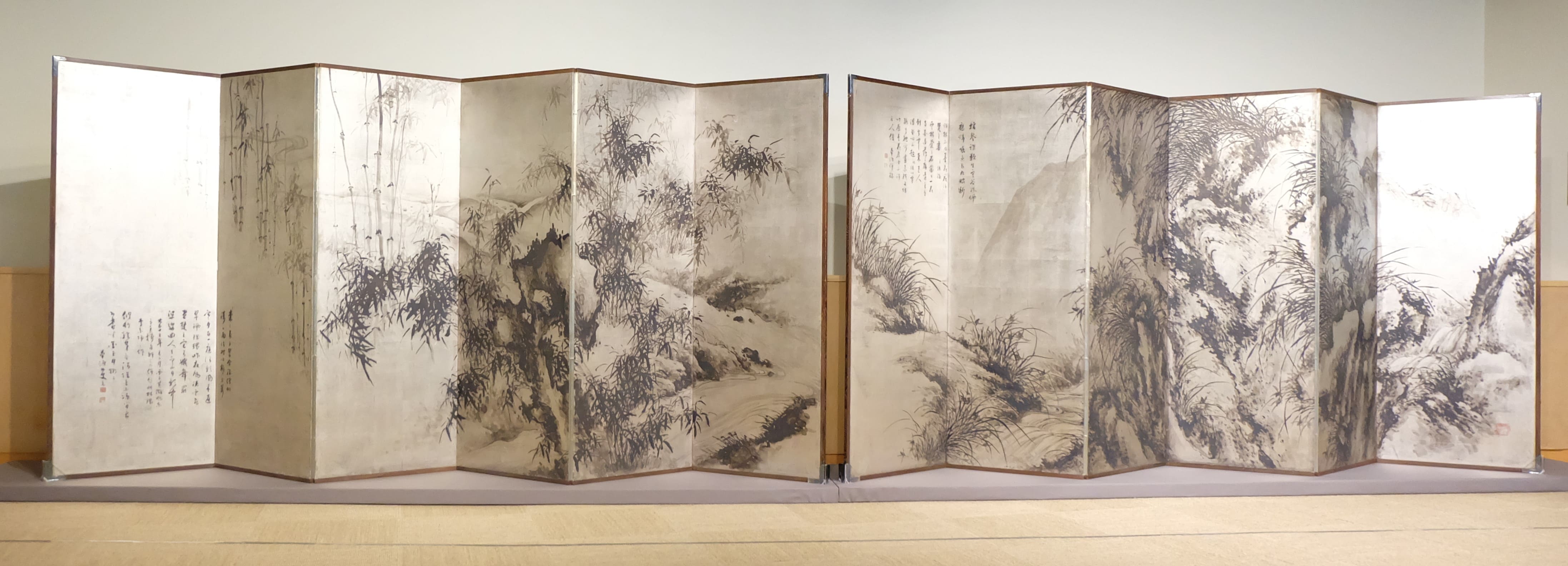 そして、この書もですね。この最初の書き出しでは、結構きちっとした感じで書かれていて、最後のところはかなり草書的に、と言うか崩す感じで書き終わっています。絵全体も、微妙にそういう風な流れがあって、それから空間も、こちら竹図は後ろが山はなくて、全部霧に霞むようですけれども、後ろから水流れが複雑に流れてきている水辺で、右隻は山の奥深くで、左隻はもう少し山を下ってきたところという感じに変化がつけられていると思います。そして、右隻は、ほの暗い谷、夕刻に咲く蘭というイメージで描かれていますけれども、左隻は水辺が広がりながら空間が開けていく、というか霧の中に遠ざかる。そして、銀によって、ほの暗さと同時に淡い月の光が満ちているような、そういう形で画面が大きく言えば構成されています。 |