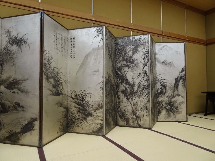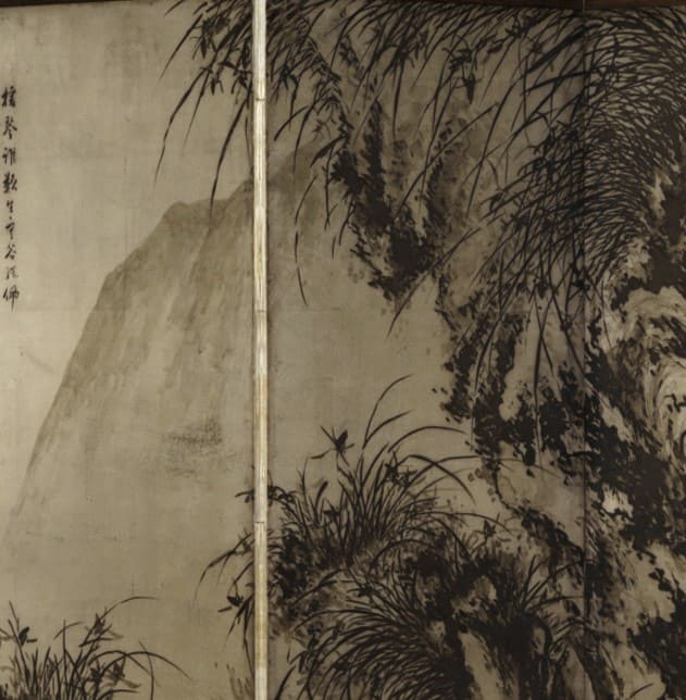 これ銀屏風なんですね。少し銀焼が起こることによって、重厚感が出てきています。金箔、箔(はく)は皆さんご存知ですよね。四角く金を叩いて伸ばして、このように箔足が見えるんですけど、この大きさのものを全部貼っていくわけですね。そして、中国ではこの箔を貼った上に描くことはしません。これは日本独特の、装飾的なこういう屏風などによく使われるやり方で、圧倒的に多いのは金です。金箔金地の襖や屏風というような形で、屏風の場合も金屏風が多いですね。中国では、金でも箔は使わないんですが、フレークを撒いて、それを撒いた紙を金箋(キンセン)って言いますけれども、その上に水墨で描くということはよくします。銀箋(ギンセン)つまり銀を使ったものはあまりなくて、水墨画を描くときも金箋、金のフレークを使った金地に描くことが多いですね。ですから、これは華涯さんとしては結構チャレンジじゃなかったかなという風に思います。そして、やはりこの銀地は水墨と非常によく合っていると感じますね。 |