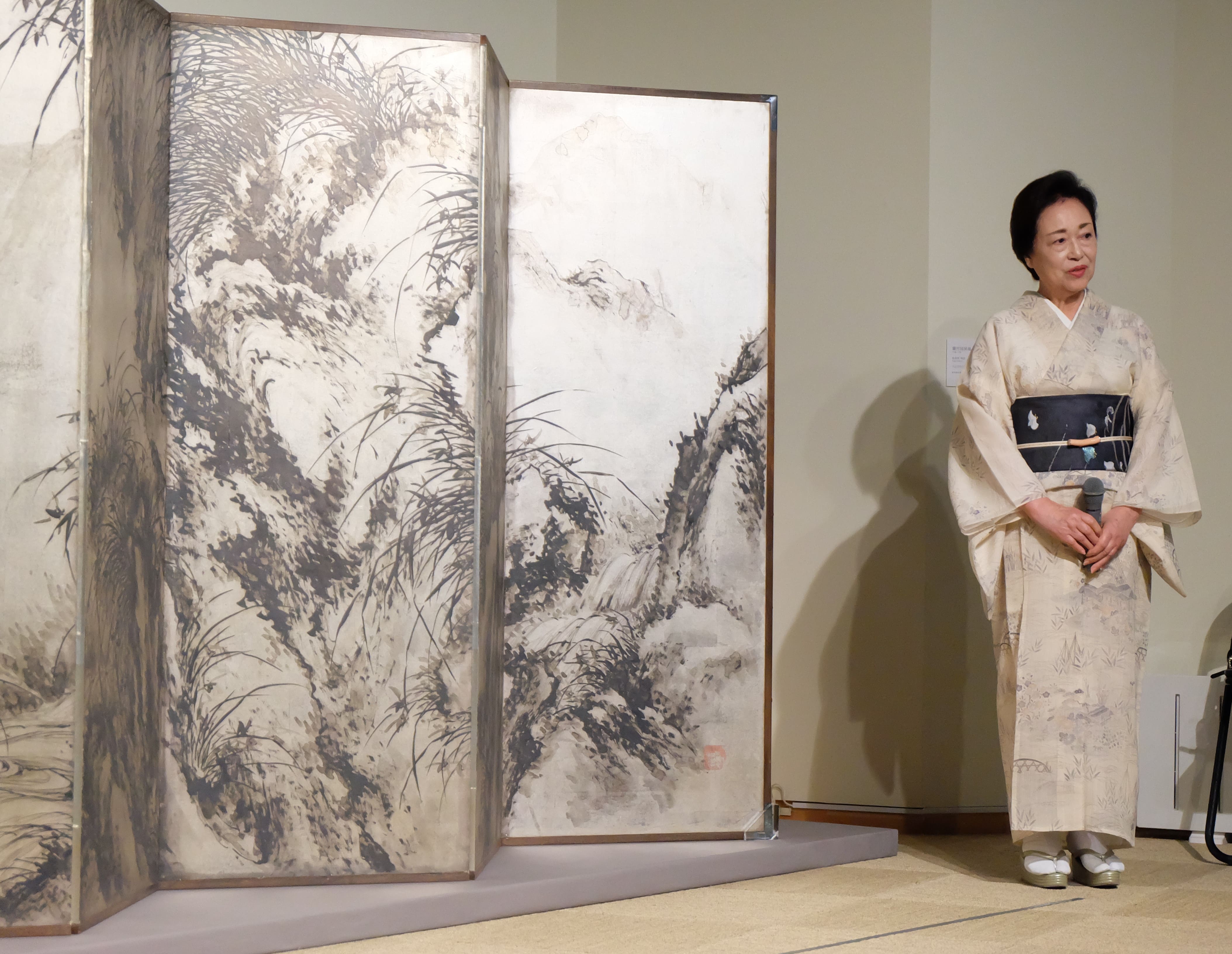 小田切)初めまして。小田切マリでございます。華涯の曾孫にあたります。本日は美術館開設25周年、本当におめでとうございます。そのような大切な時に華涯の屏風を飾っていただき、陽三様とのー匂い立つ黒と黒―のコラボが叶いましたことを本当にありがたく思っております。皆さま、本日はお越し頂き誠にありがとうございます。私はご紹介頂きましたが、華涯のひ孫にあたり、華涯が住んでおりました家で生まれ育ちましたので、華涯の物に埋もれて育ったようなものでございまして、お話ししたいことはいっぱいございますが、先ほど宮崎先生から丁寧にご解説いただきましたので、華涯の話はやめにして、今日はこの美術館が25年前にできました時の話をご紹介させていただこうと思います。 そうこうしているうちに、80代になられた陽三様が、「自分はアメリカに永住する。こちらに墓も作る」と言ってこられたのだそうです。それで一族皆で心配して、「どうしてそんなことを言うのですか。とにかく帰ってきてください。」といくら手紙を書いてお願いをしても聞き入れてくださらない。それで甥の道雄様が、一族の思いを受けて、サンフランシスコまで行って説得にあたられたそうなのです。 |