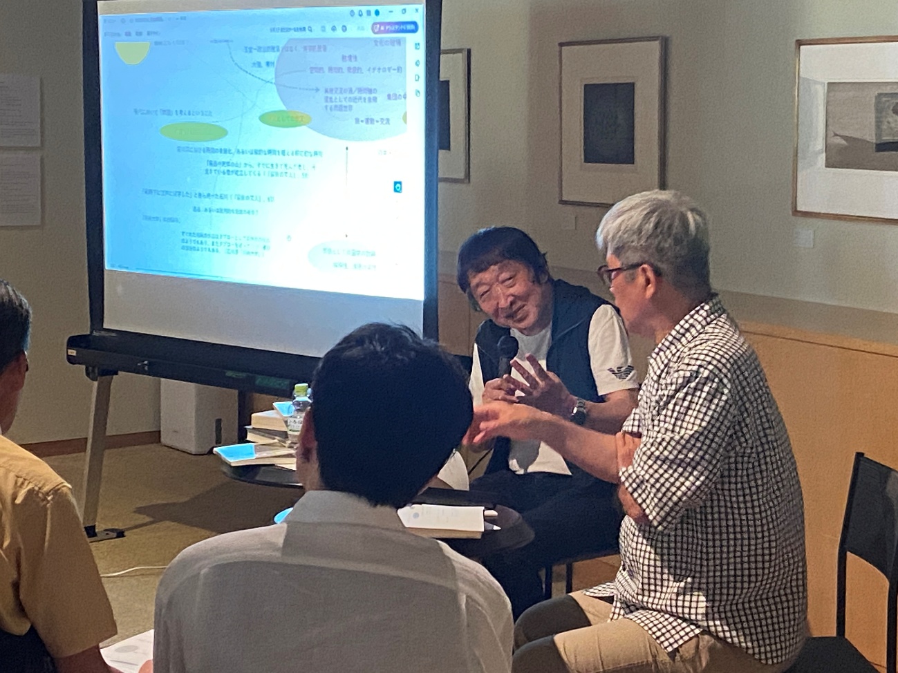 その南画のスピリットを現代に生かしながら制作活動をしている方々を今回、展示しているというわけなんです。 (M)寝返るという表現がいいのかどうか、分かりませんが、現代詩について書きながら、古典についても書くということを繰り返している。 (K)そうそう。 (M)だけど、その美術批評の方の御三家の人たちの書くものから、日本の古典は消えていくんです。すごく不思議なことなんですけども、簡単に言うと、やはり弁証法的進歩史観が戦後の高度経済成長期だったということともかかわるのでしょうが、美術の世界は西洋からの輸入ということを重要視して、「最新のもの」を追い続けなければならないという命題が彼らの意識を規定してきたところがある。もともとこの御三家はみんな花田清輝の深い影響下からものを書き始めるのですが、当の花田は日本の古典についていろいろと書き続けるという奇妙な差が生じる。それは吉本もしかりで、花田清輝、吉本隆明といった文芸評論を中心にやる人たちは、日本の古典について行きつ戻りつしながらずっと書き続けるんだけど、なぜか美術批評の世界ではそれがなくなってしまう。