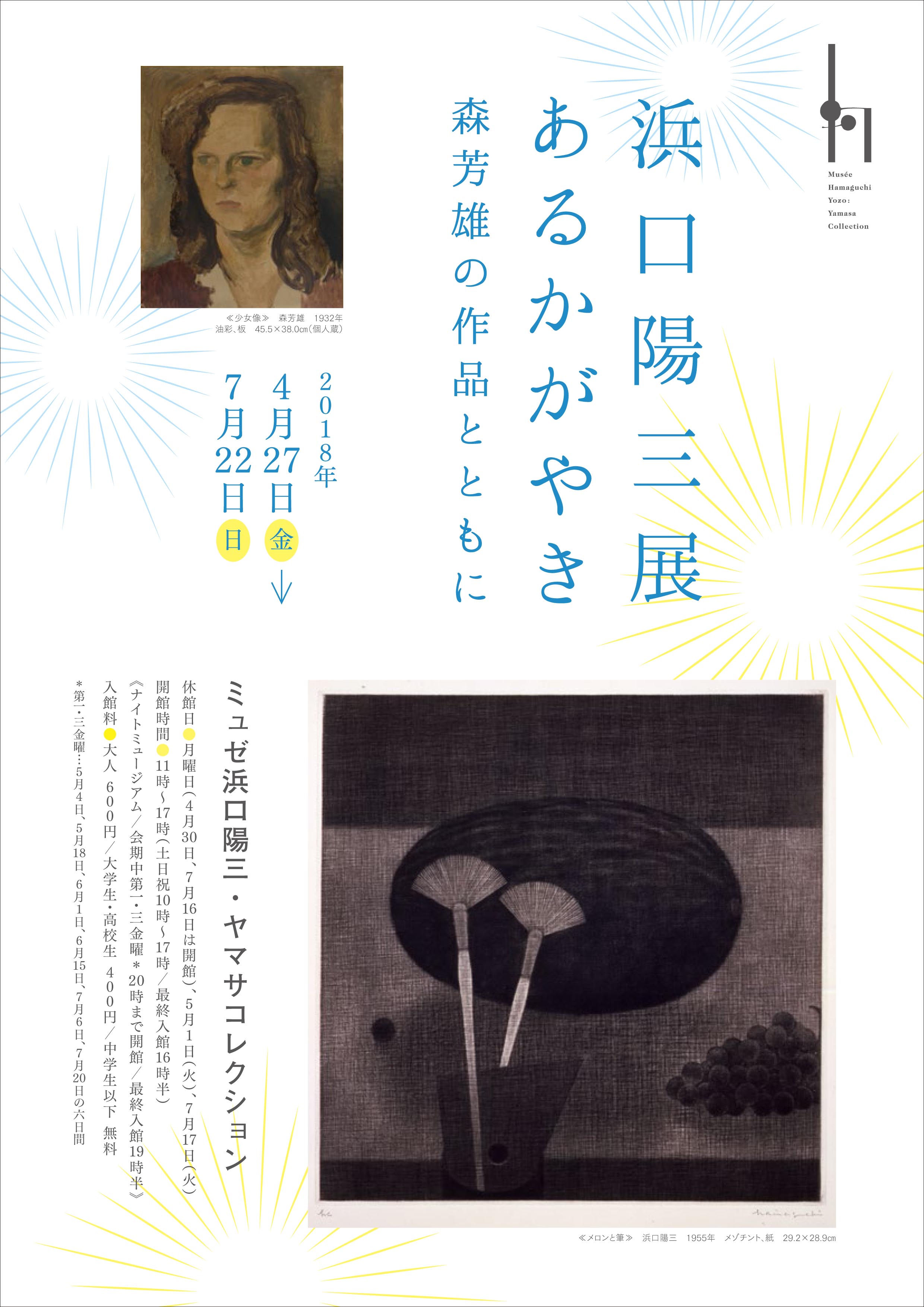 銅版画家・浜口陽三が芸術家として開花する時代を共にした洋画家・森芳雄との交流を浜口の銅版画他約50 点と、森芳雄の油彩画6 点、素描や資料による構成で紹介します。