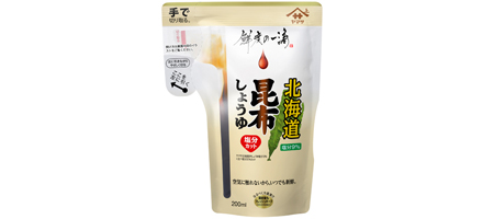 また、今回は「鮮度の一滴」の200mlパウチタイプでの発売となります。食卓にぴったりな卓上サイズで、「鮮度の一滴」の特長である、注ぎ口の特殊な薄いフィルムが、何度注いでも中に空気を入れず酸化を防いで鮮度を保ちます。開封後も長い間、色と香りが変わらず、いつまでも昆布の風味豊かなしょうゆをお楽しみいただけます。