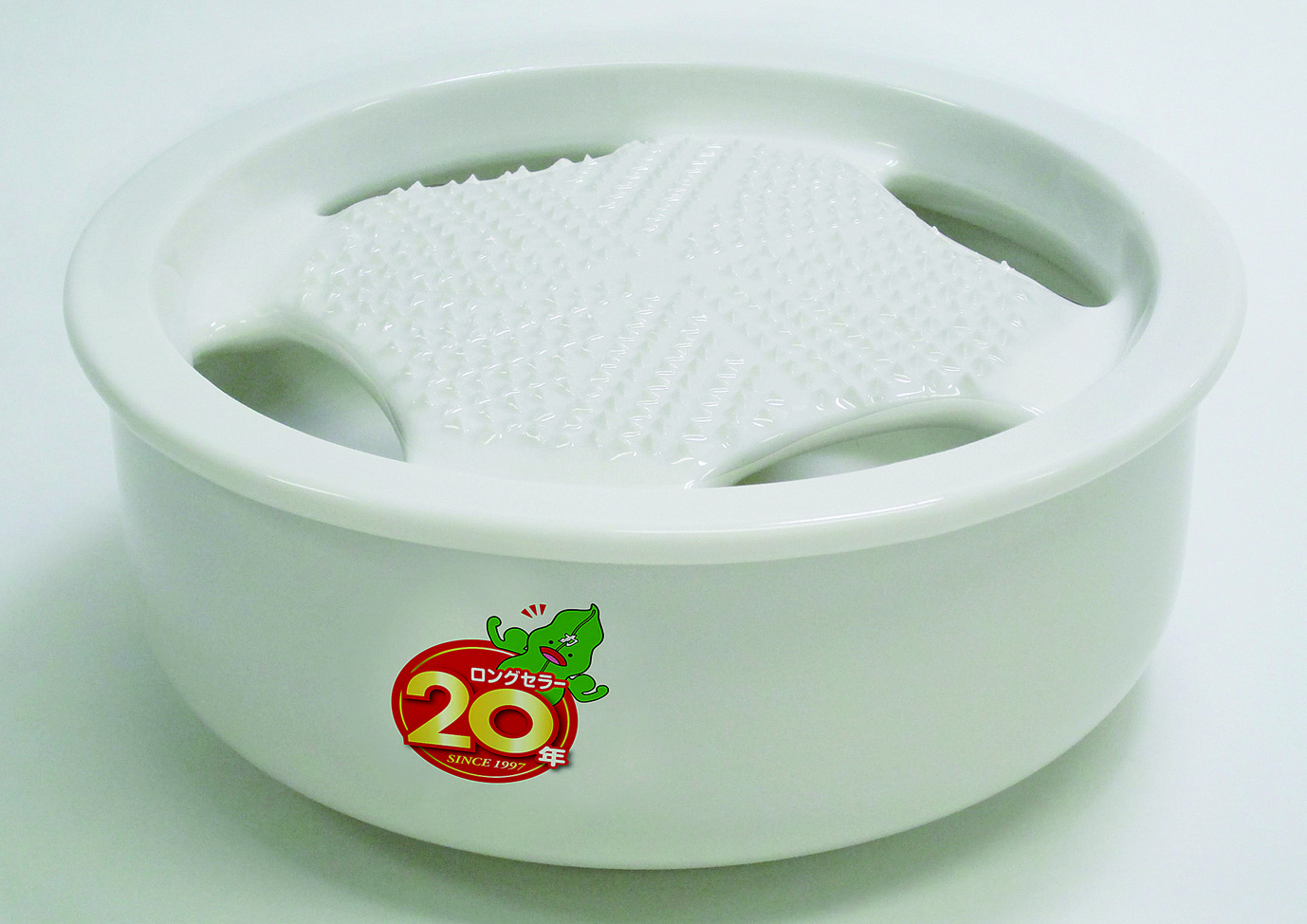 本キャンペーンは、昆布の旨味と食材の旨味が合わさるとよりおいしくなる「昆布のチカラ」の化身、キャラクターの「チカラコンブくん」をあしらった20周年オリジナルロゴ入りの「セラミック受け皿付おろし器」を、「ヤマサ 昆布つゆ500mℓパック/1ℓパック/1.8ℓハンディボトル」を購入した方を対象に、4~9月まで毎月200名様合計1,200名様に抽選でプレゼントします。おろしている途中もすべりにくいシリコーンすべり止め付で、臭いうつりが少なく、洗いやすいセラミック製のおろし器です。