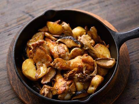 こんがり焼いた手羽・じゃがいも・きのこにバターと「ヤマサ昆布ぽん酢」でジュワッと仕上げ。立ち上る香りが食欲をそそります!