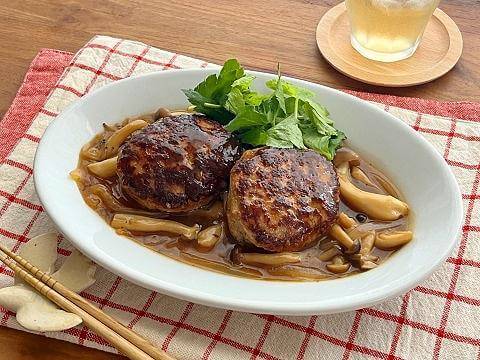 「ヤマサ昆布ぽん酢」としめじや玉ねぎなどの野菜を一緒に煮込むことで、旨味たっぷりの具沢山なハンバーグが完成!