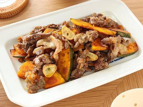 ■牛肉とかぼちゃのガーリック昆布ぽん酢炒め