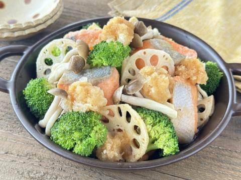 秋さけとれんこんに大根おろし、そして「ヤマサ昆布ぽん酢」をかけて、旨味がありながらさっぱりとした後味。フライパンひとつで魚も野菜もたっぷり食べられるうれしい一皿です。