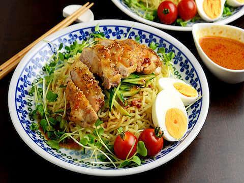 しっかり焼いた鶏ももステーキを、冷たい中華麺に豪快にオン!濃厚な「ヤマサごまだれ専科」と「ヤマサ鮮度生活 特選丸大豆しょうゆ」の旨味で、さっぱりなのに満足感たっぷり。
