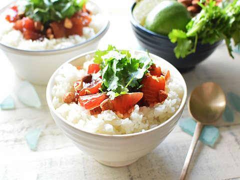 「ヤマサ鮮度生活 特選丸大豆しょうゆ」でまぐろを軽く漬け、ライムごはんとアーモンドでエスニックなテイストをプラス。パクチーの香りが爽やかさを引き立て、夏でもペロリと食べられる一杯です。