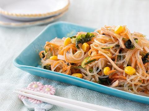 きゅうり・にんじんのシャキシャキ野菜にハムやコーン、戻した春雨をたっぷり合わせたヘルシーサラダ。「ヤマサ鮮度生活 減塩しょうゆ」とごま油、砂糖・酢のシンプルなタレで、さっぱりしつつもしっかり旨味が楽しめます。