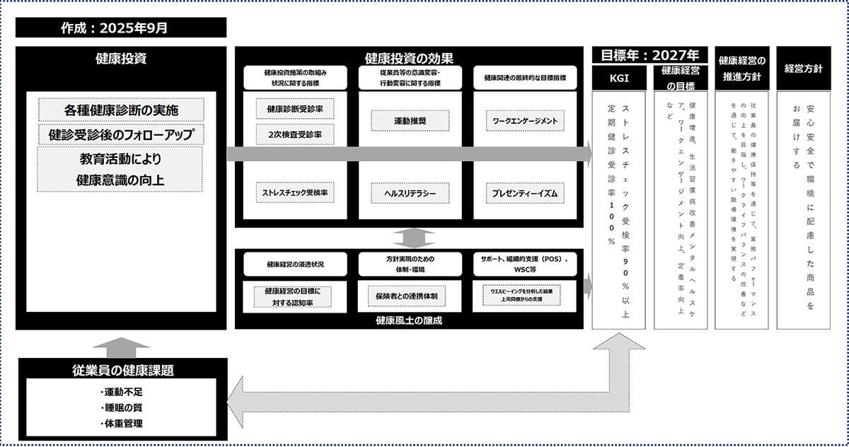 従業員の心身の健康状態を分析するため、「ウェルビーイングナビ(調査)」の実施を始めました。Body(健康的な体)、